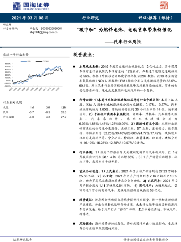 【国海证券】【20210308】“碳中和”为燃料电池、电动货车带来新催化——汽车行业周报-12页