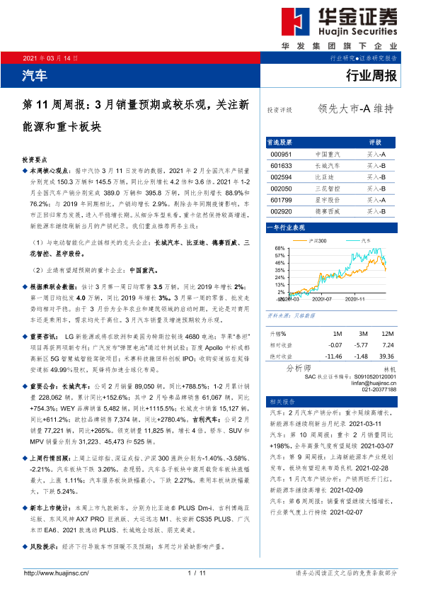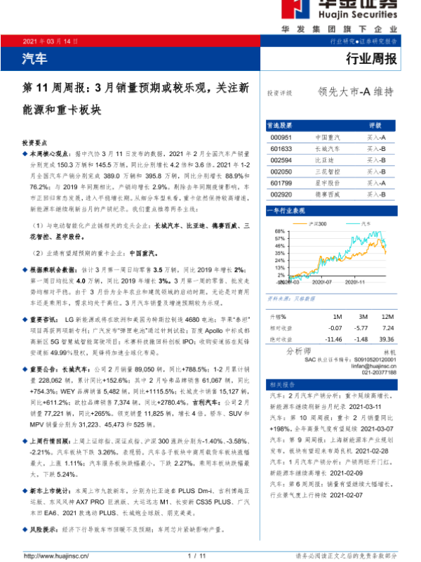 【华金证券】【20210314】汽车第11周周报:3月销量预期或较乐观,关注新能源和重卡板块-11页