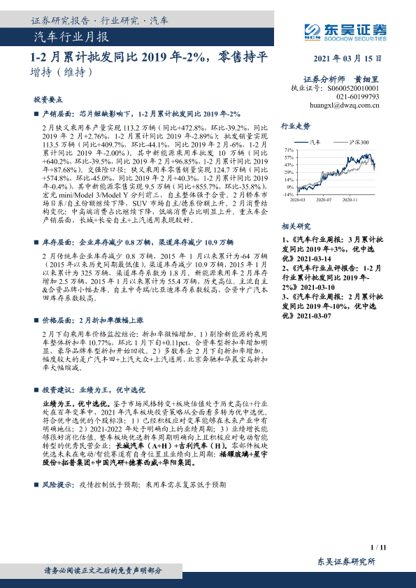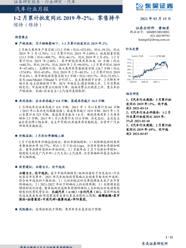 【东吴证券】【20210315】20210315-东吴证券-汽车行业月报:1-2月累计批发同比2019年-2%,零售持平-11页