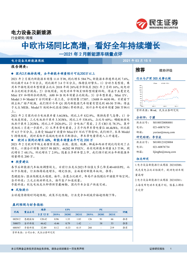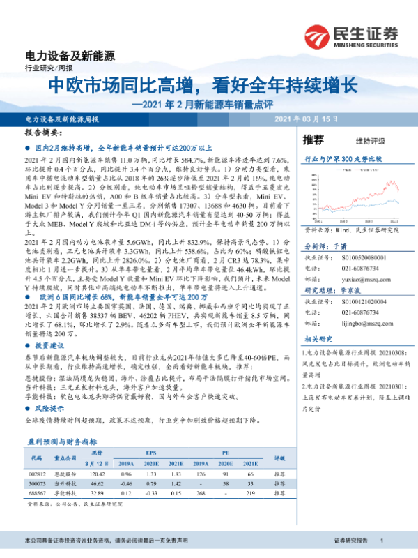 【民生证券】【20210315】2021年2月新能源车销量点评:中欧市场同比高增,看好全年持续增长-12页