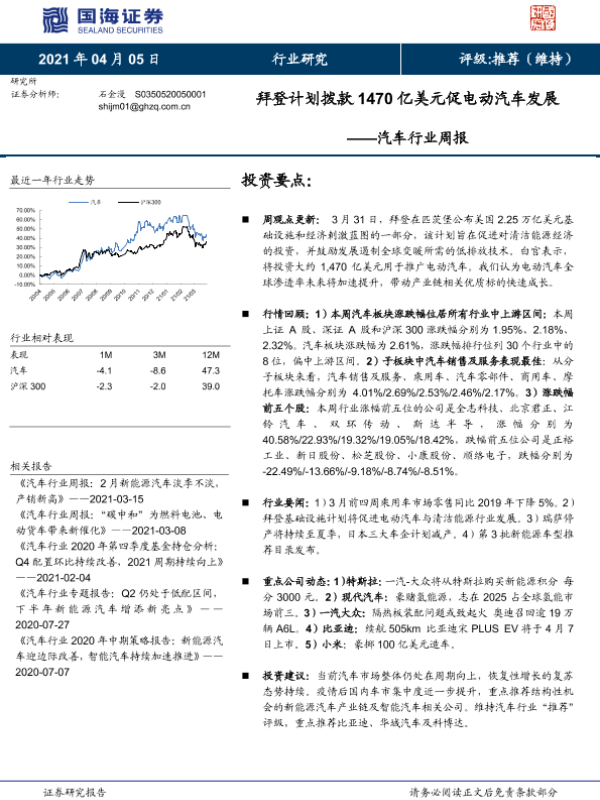 【国海证券】【20210405】汽车行业周报:拜登计划拨款1470亿美元促电动汽车发展-14页