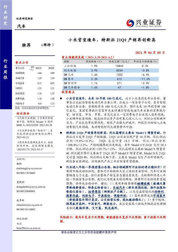 【兴业证券】【20210405】20210405-兴业证券-汽车行业周报:小米官宣造车,特斯拉21Q1产销再创新高-24页
