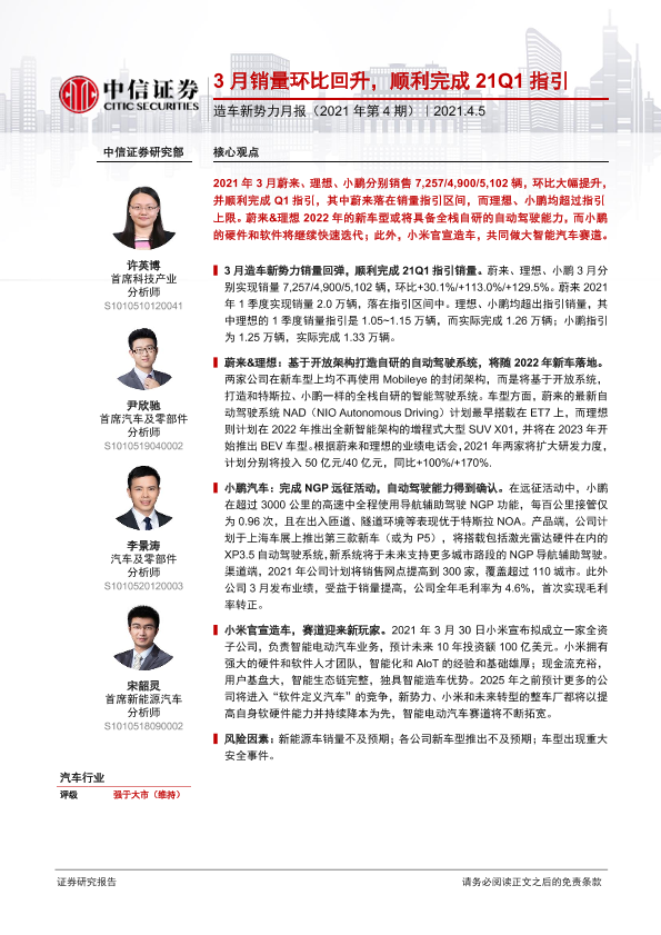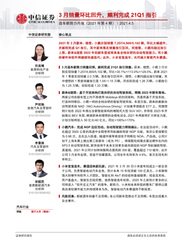 【中信证券】【20210405】造车新势力月报(2021年第4期)-3月销量环比回升,顺利完成21Q1指引-9页