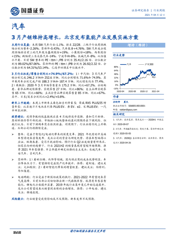 【国盛证券】【20210412】20210412-国盛证券-汽车行业周报:3月产销维持高增长,北京发布氢能产业发展实施方案-11页