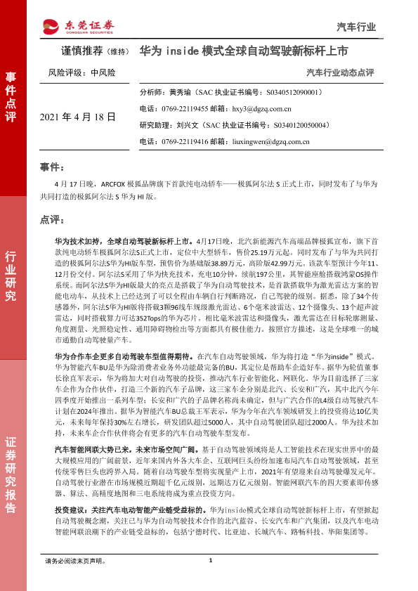【东莞证券】【20210418】汽车行业动态点评:华为inside模式全球自动驾驶新标杆上市-3页