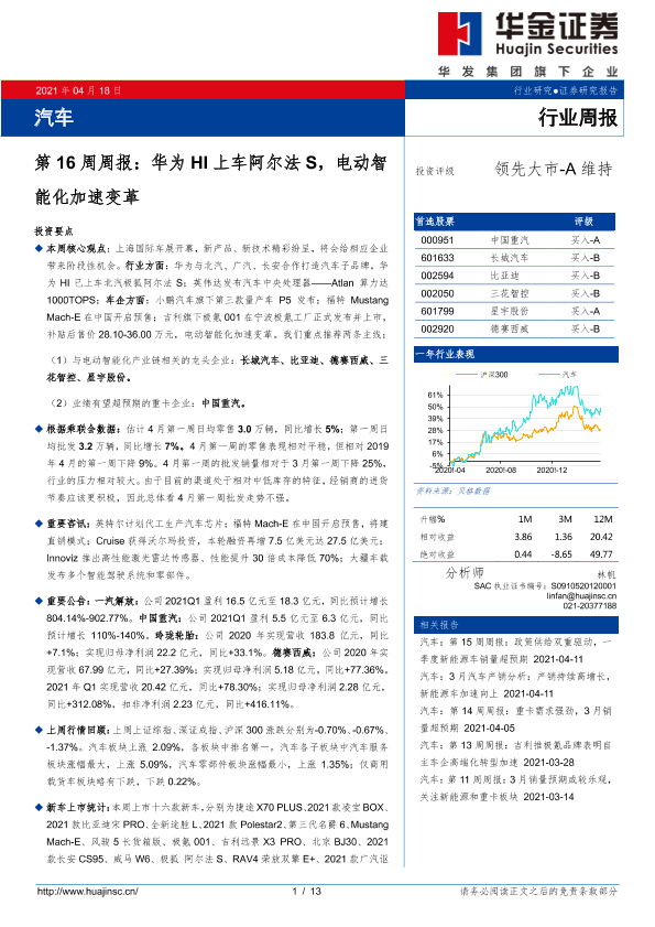 【华金证券】【20210418】汽车第16周周报:华为HI上车阿尔法S,电动智能化加速变革-13页