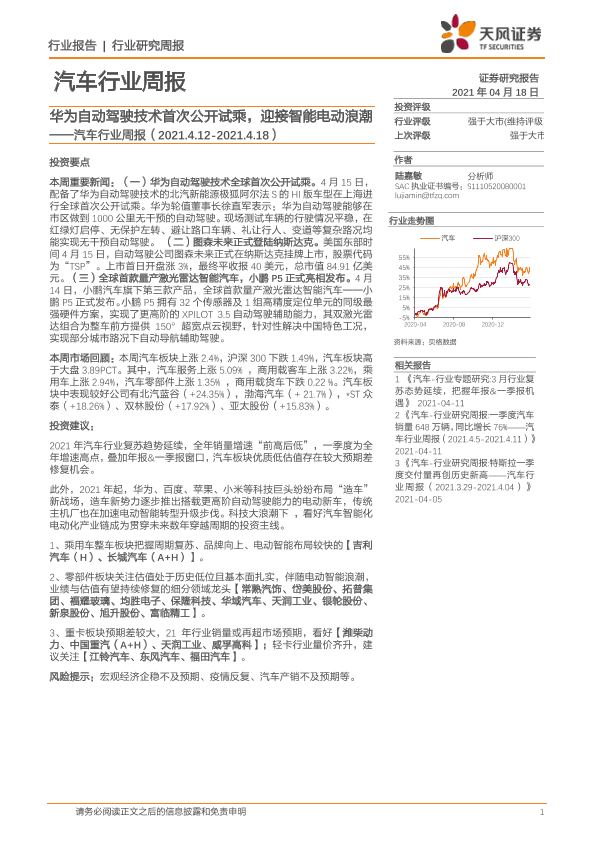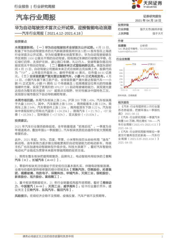 【天风证券】【20210418】20210418-天风证券-汽车行业周报:华为自动驾驶技术首次公开试乘,迎接智能电动浪潮-13页