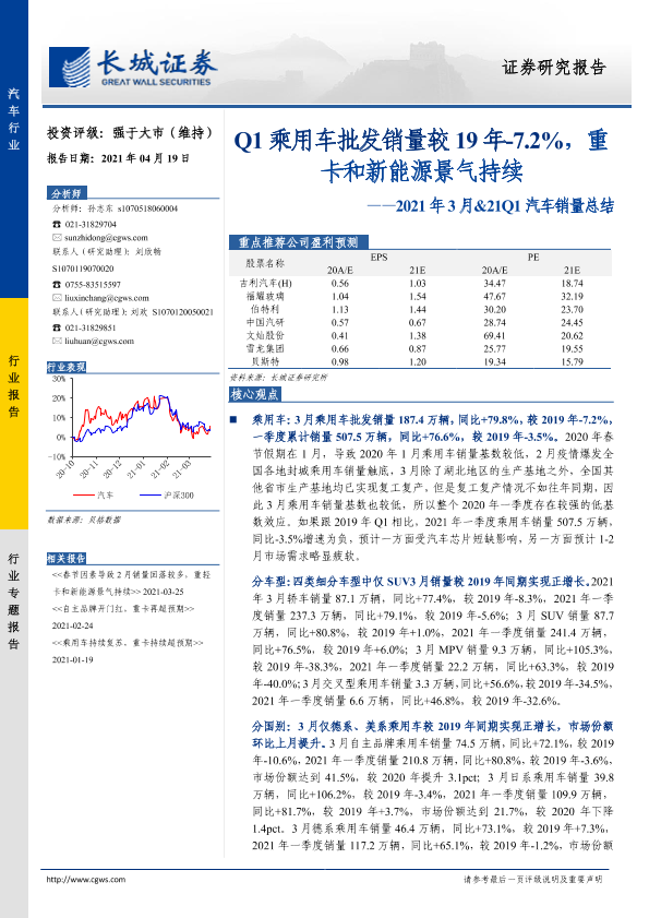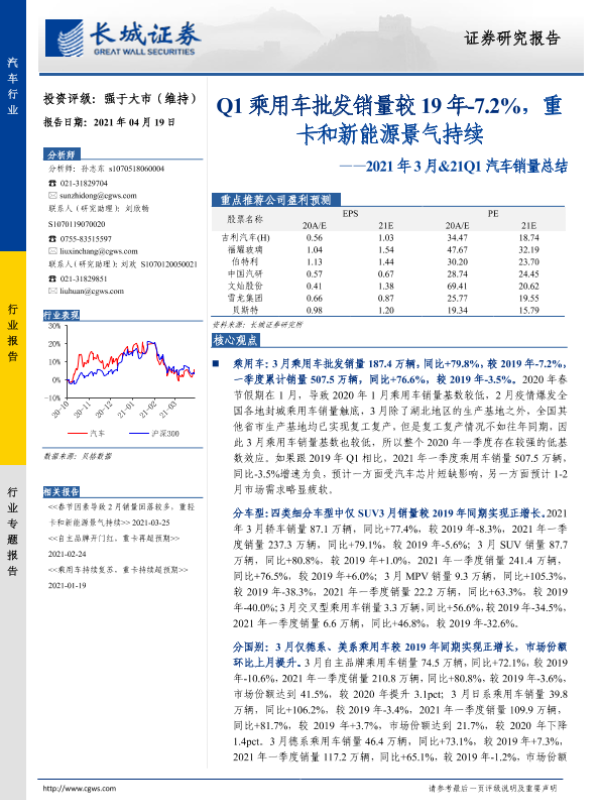 【长城证券】【20210419】2021年3月&21Q1汽车销量总结:Q1乘用车批发销量较19年-7.2%,重卡和新能源景气持续-24页