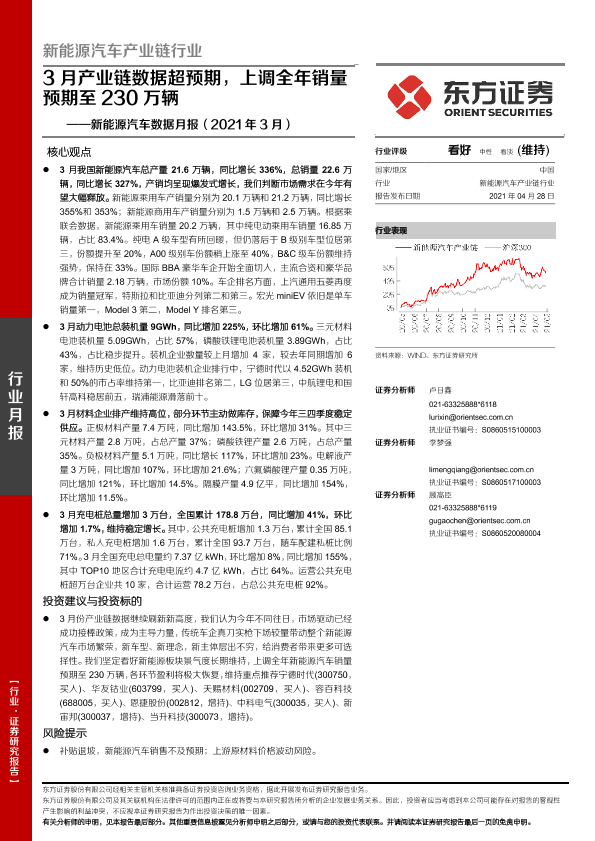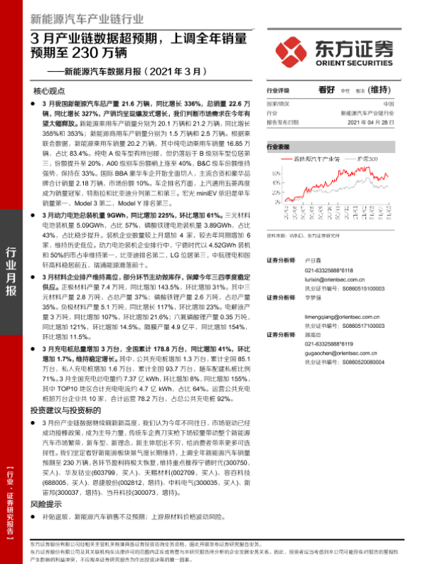 【东方证券】【20210428】20210428-东方证券-新能源汽车数据月报(2021年3月):3月产业链数据超预期,上调全年销量预期至230万辆-24页