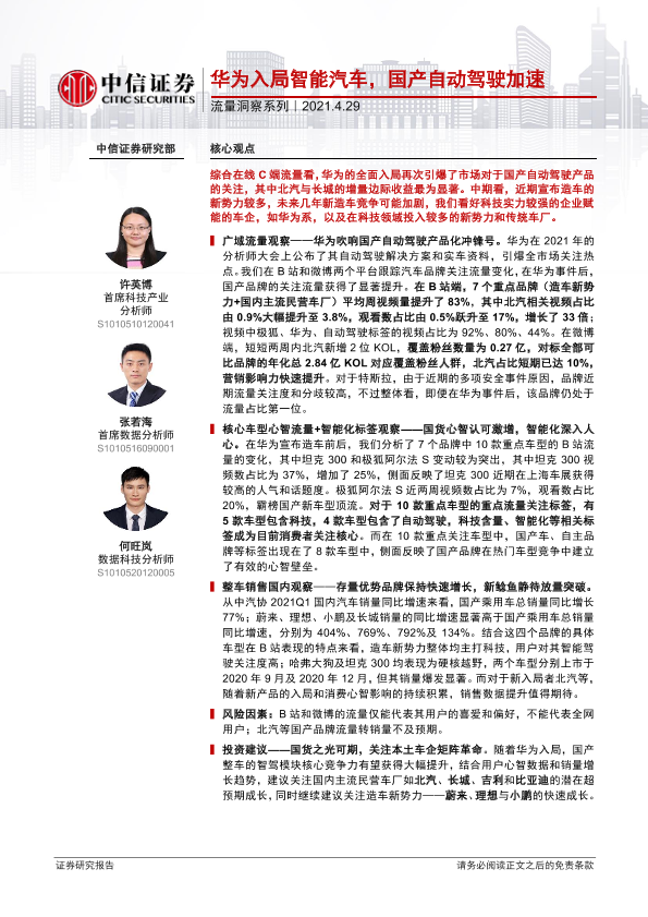 【中信证券】【20210429】流量洞察系列:华为入局智能汽车,国产自动驾驶加速-9页