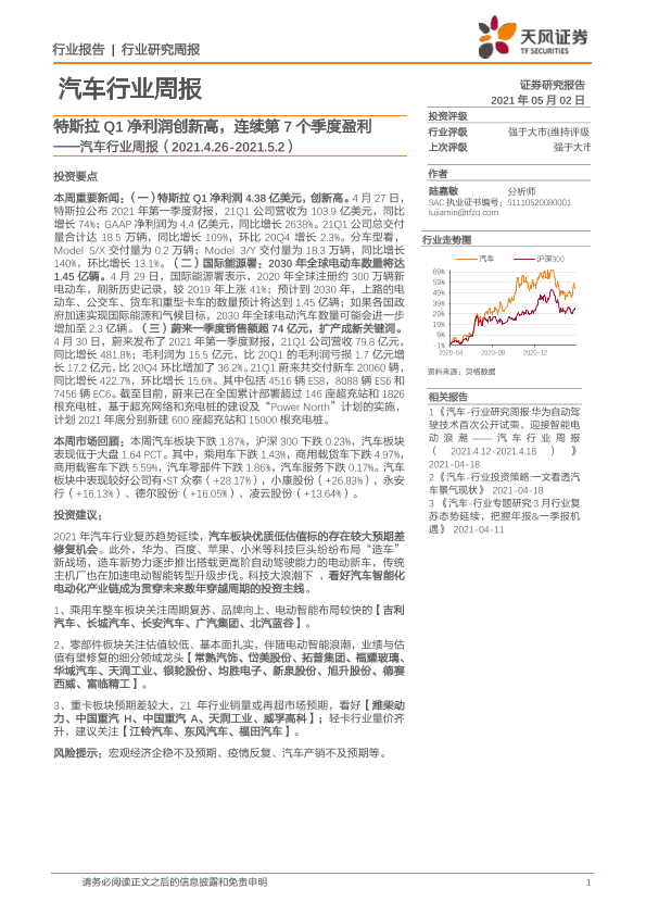 【天风证券】【20210502】20210502-天风证券-汽车行业周报:特斯拉Q1净利润创新高,连续第7个季度盈利-15页