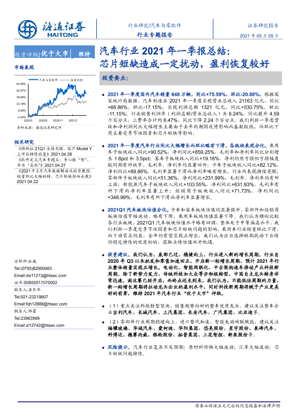 一季报 汽车行业 盈利恢复 芯片短缺 证券研究