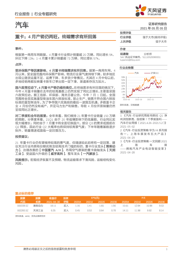 【天风证券】【20210505】重卡:4月产销仍两旺,终端需求有所回落-11页