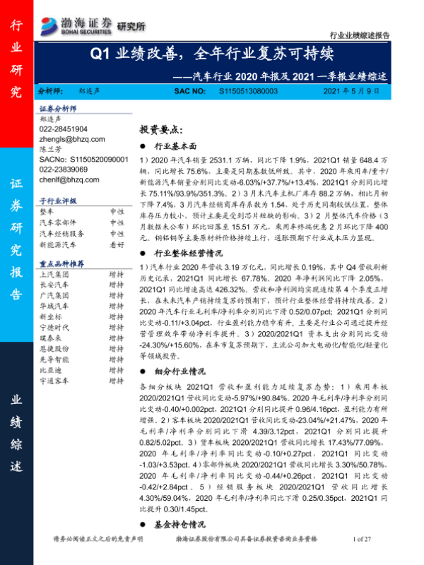 【渤海证券】【20210509】汽车行业2020年报及2021一季报业绩综述:Q1业绩改善,全年行业复苏可持续-27页