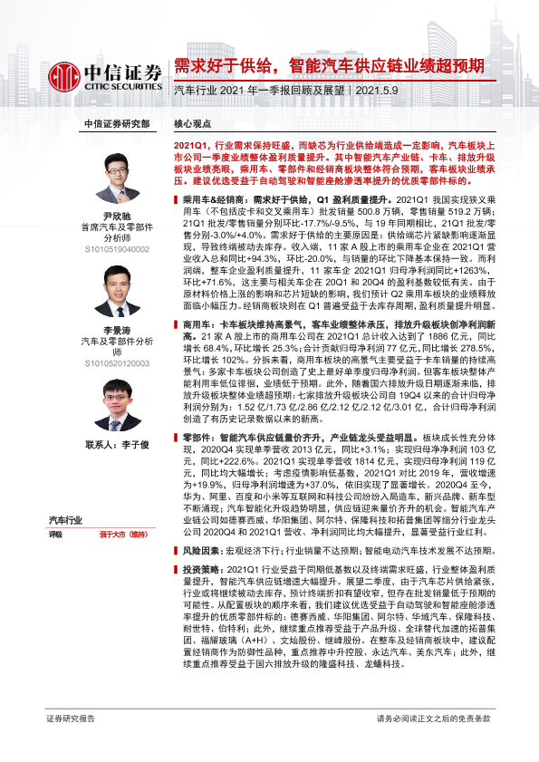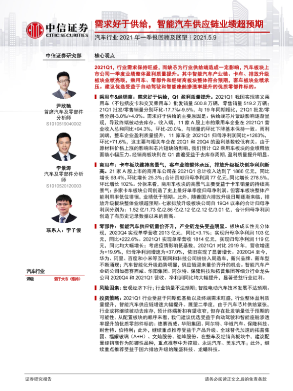 【中信证券】【20210509】汽车行业2021年一季报回顾及展望:需求好于供给,智能汽车供应链业绩超预期-18页