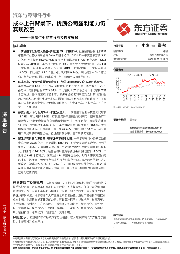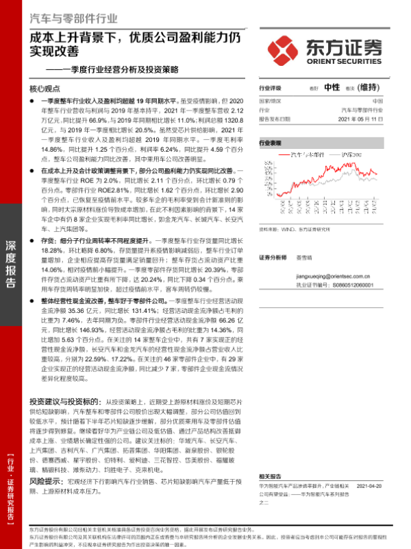 【东方证券】【20210511】汽车与零部件:一季度行业经营分析及投资策略-成本上升背景下,优质公司盈利能力仍实现改善-24页