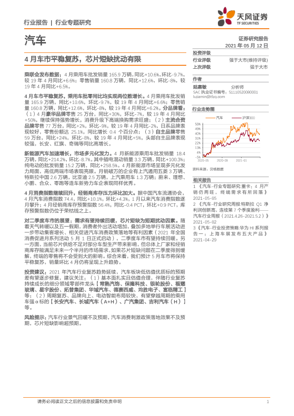 【天风证券】【20210512】汽车行业专题研究:4月车市平稳复苏,芯片短缺扰动有限-9页
