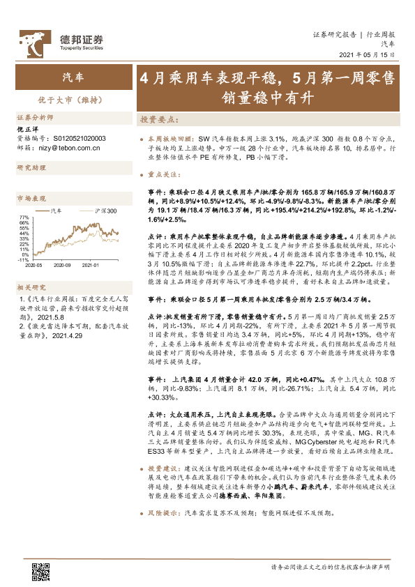 【德邦证券】【20210515】20210515-德邦证券-汽车行业周报:4月乘用车表现平稳,5月第一周零售销量稳中有升-14页