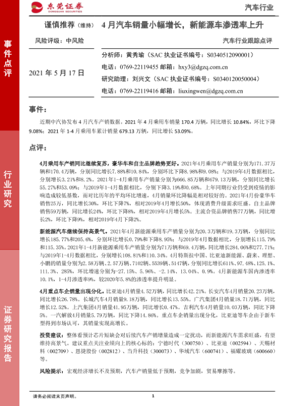 【东莞证券】【20210517】20210517-东莞证券-汽车行业跟踪点评:4月汽车销量小幅增长,新能源车渗透率上升-3页