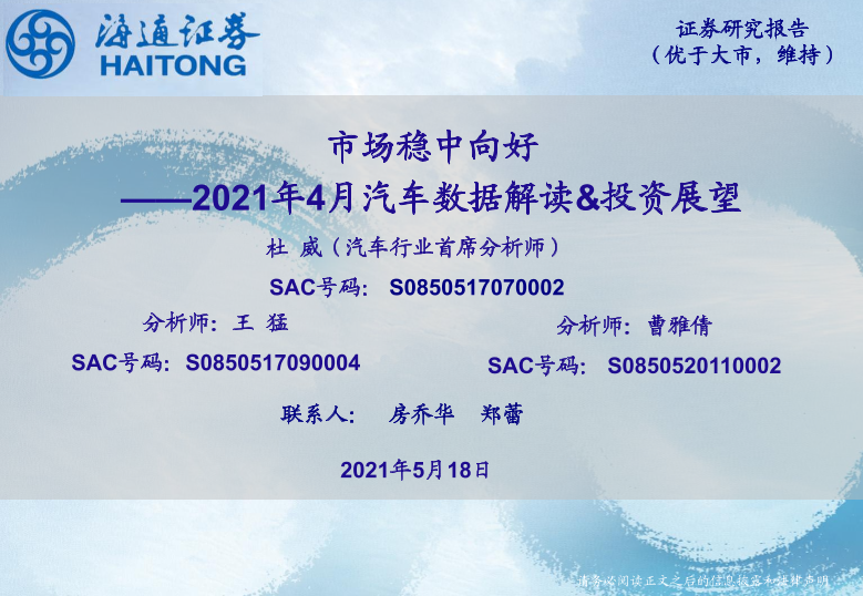 【海通证券】【20210518】2021年4月汽车数据解读&投资展望:市场稳中向好-23页