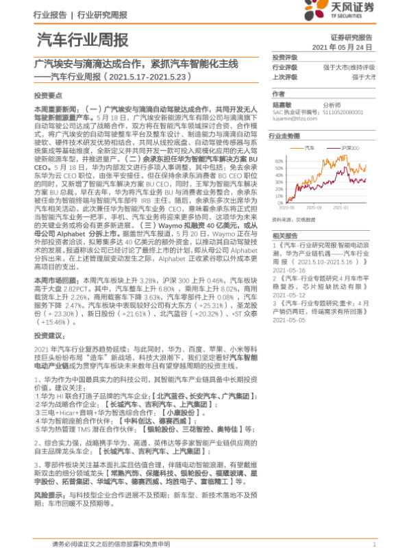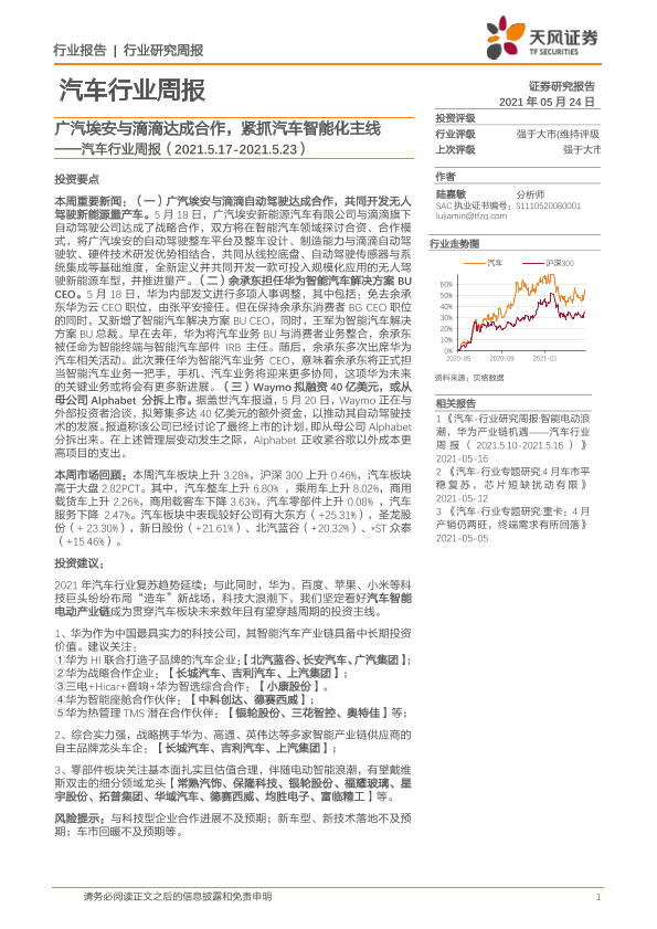 【天风证券】【20210524】20210524-天风证券-汽车行业周报:广汽埃安与滴滴达成合作,紧抓汽车智能化主线-13页