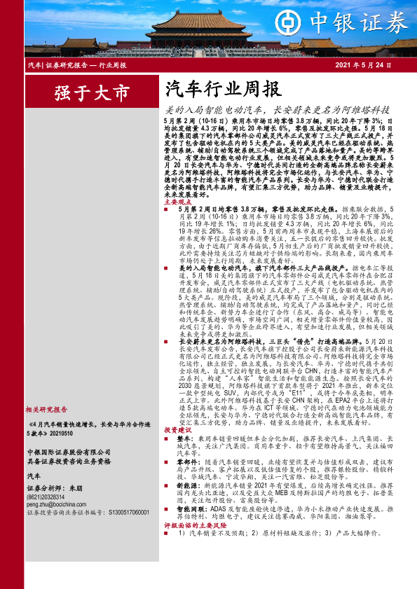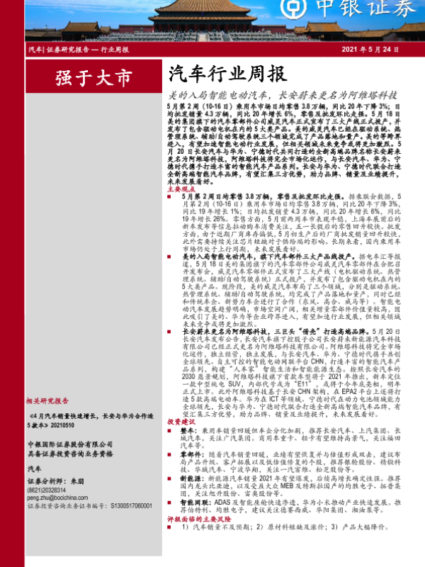 【中银证券】【20210524】中银证券-汽车行业周报:美的入局智能电动汽车,长安蔚来更名为阿维塔科技-13页