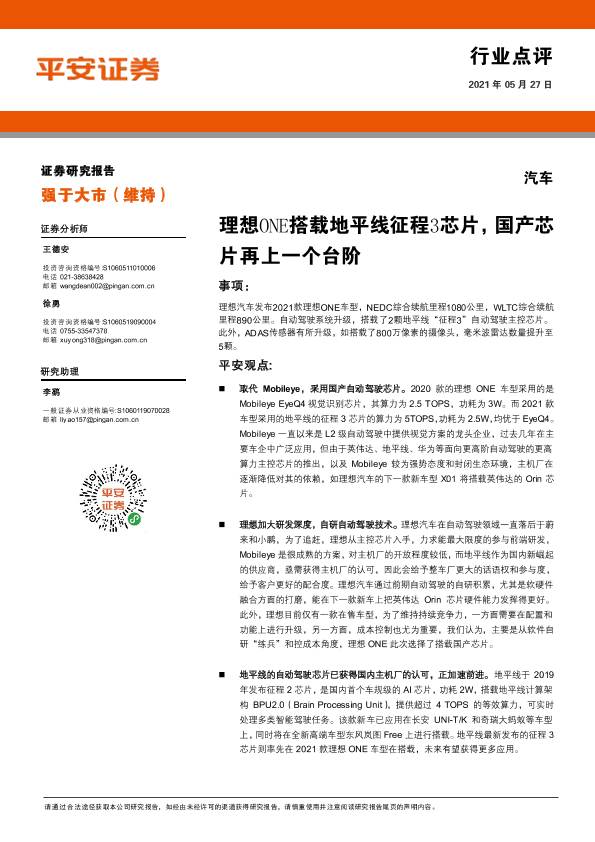 【平安证券】【20210527】理想ONE搭载地平线征程3芯片,国产芯片再上一个台阶-3页