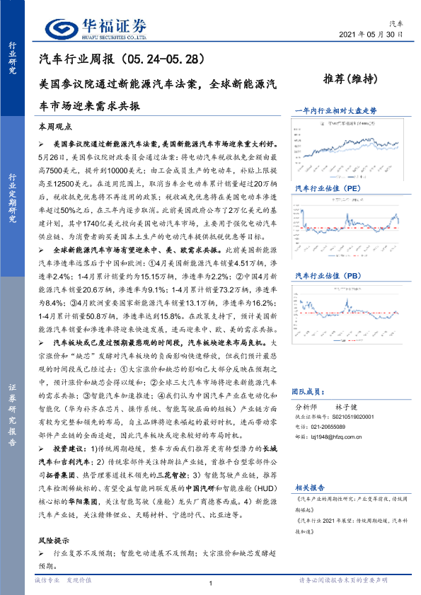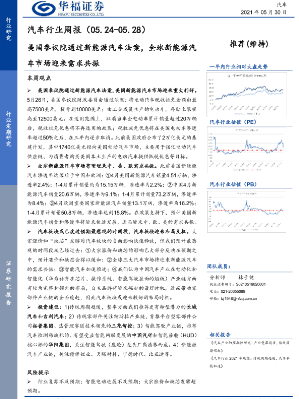 【华福证券】【20210530】汽车行业周报:美国参议院通过新能源汽车法案,全球新能源汽车市场迎来需求共振-7页