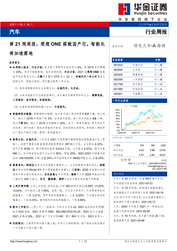 【华金证券】【20210530】汽车第21周周报:理想ONE搭载国产芯,智能化将加速落地-12页