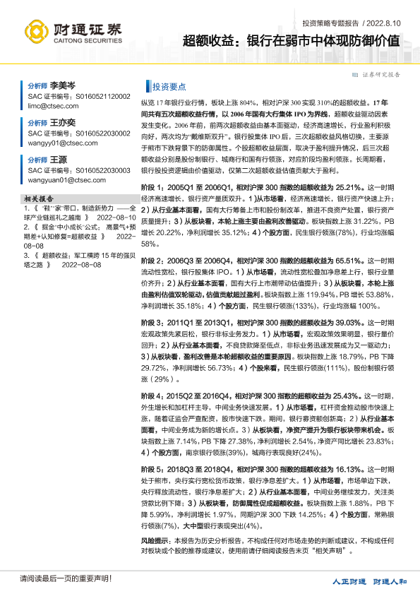 【财通证券】【20220810】投资策略专题报告:超额收益,银行在弱市中体现防御价值-33页