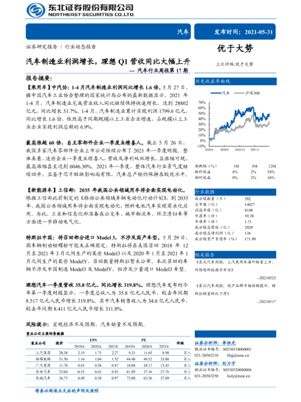 【东北证券】【20210531】汽车制造业利润增长,理想Q1营收同比大幅上升-17页