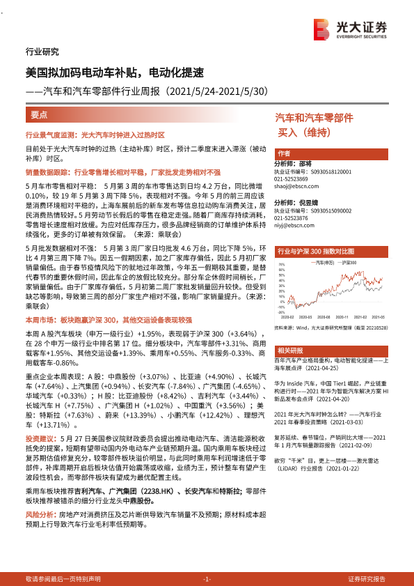 【光大证券】【20210530】汽车和汽车零部件行业周报:美国拟加码电动车补贴,电动化提速-18页