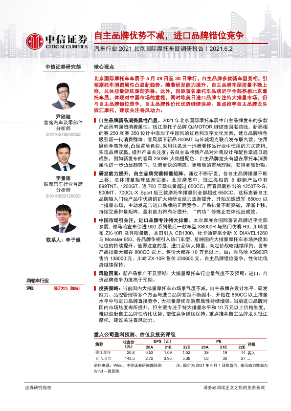 【中信证券】【20210602】汽车行业2021北京国际摩托车展调研报告:自主品牌优势不减,进口品牌错位竞争-11页