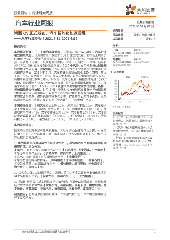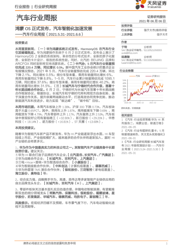 【天风证券】【20210606】20210606-天风证券-汽车行业周报:鸿蒙OS正式发布,汽车智能化加速发展-13页