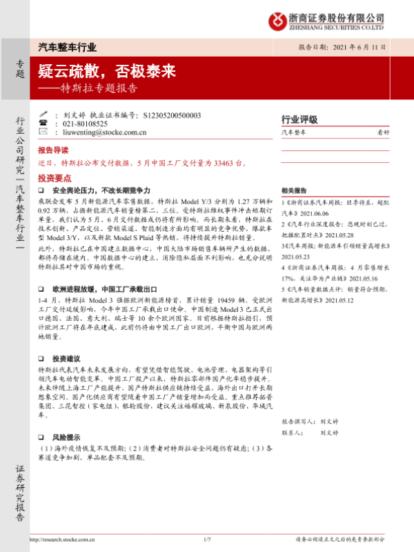 【浙商证券】【20210611】汽车整车行业:特斯拉专题报告-疑云疏散,否极泰来-7页