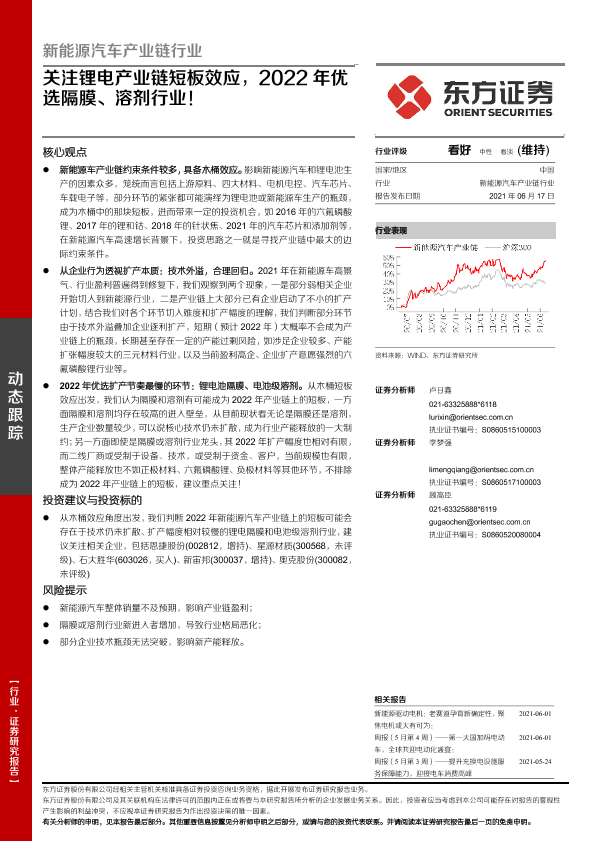 【东方证券】【20210617】新能源汽车产业链行业动态跟踪:关注锂电产业链短板效应,2022年优选隔膜、溶剂行业!-3页