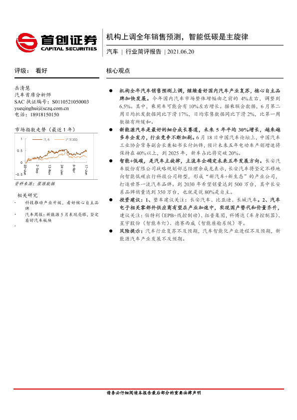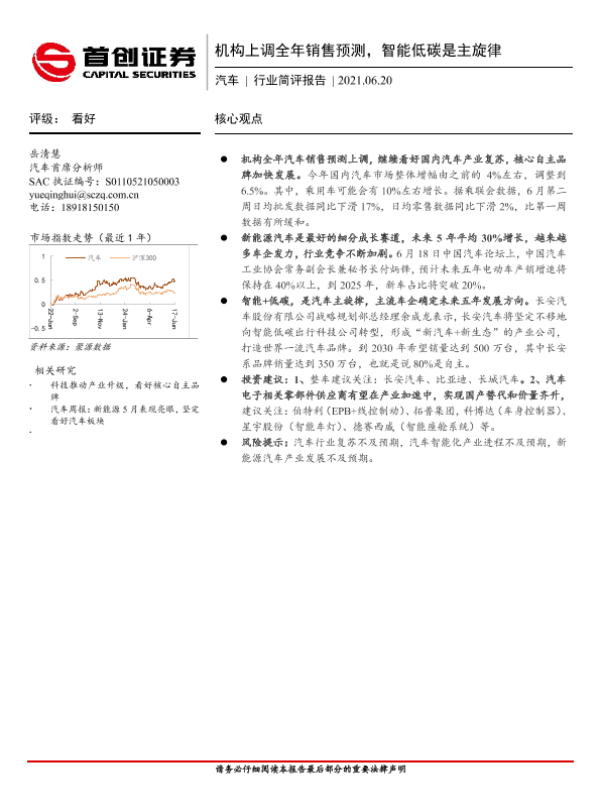 【首创证券】【20210620】20210620-首创证券-汽车行业简评报告:机构上调全年销售预测,智能低碳是主旋律-10页
