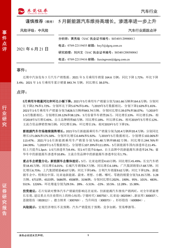 【东莞证券】【20210621】汽车行业跟踪点评:5月新能源汽车维持高增长,渗透率进一步上升-3页