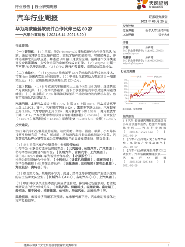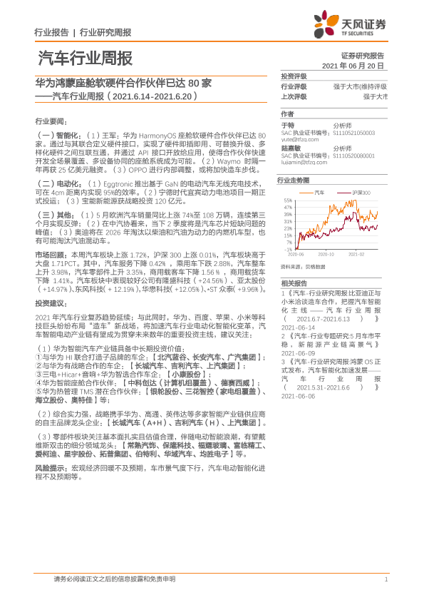 【天风证券】【20210620】20210620-天风证券-汽车行业周报:华为鸿蒙座舱软硬件合作伙伴已达80家-16页