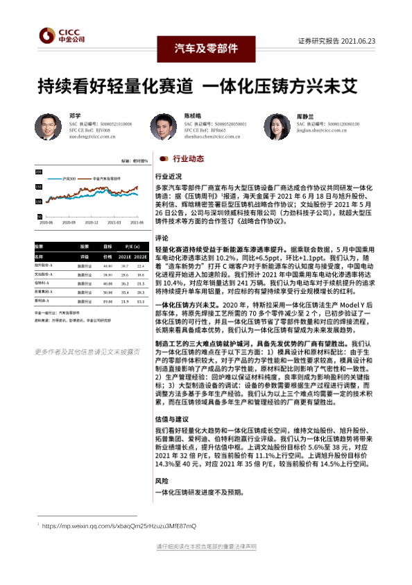 【中金公司】【20210623】汽车及零部件行业动态:持续看好轻量化赛道 一体化压铸方兴未艾-5页