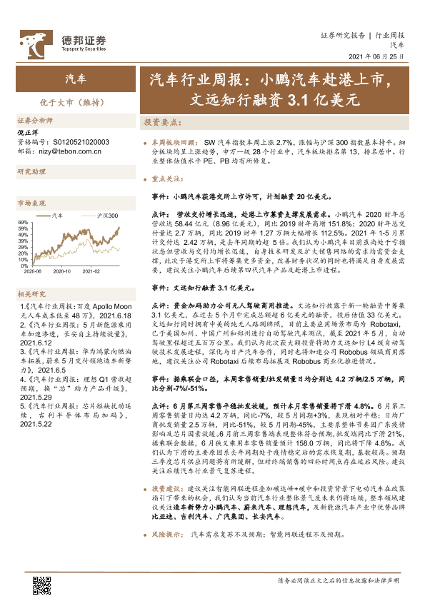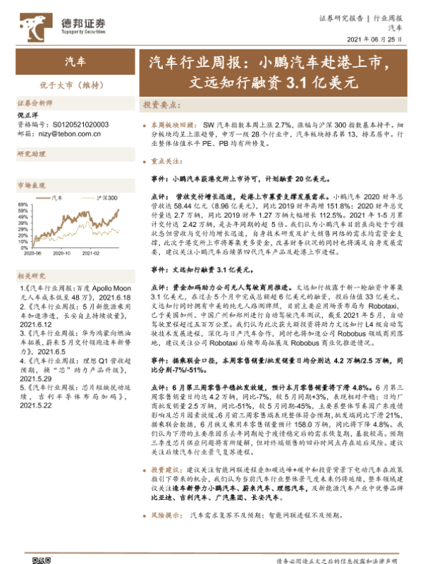【德邦证券】【20210625】20210625-德邦证券-汽车行业周报:小鹏汽车赴港上市,文远知行融资3.1亿美元-14页