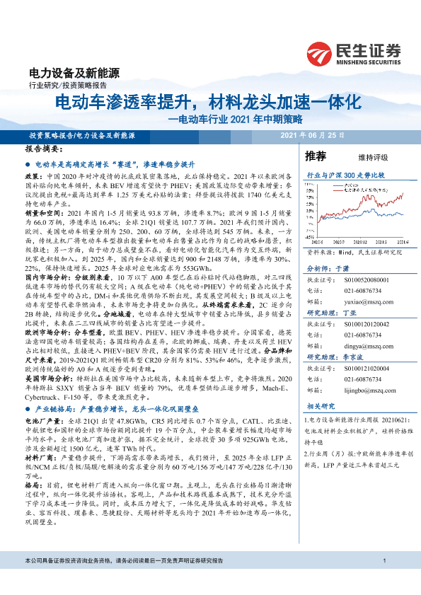 【民生证券】【20210625】电动车渗透率提升,材料龙头加速一体化-36页