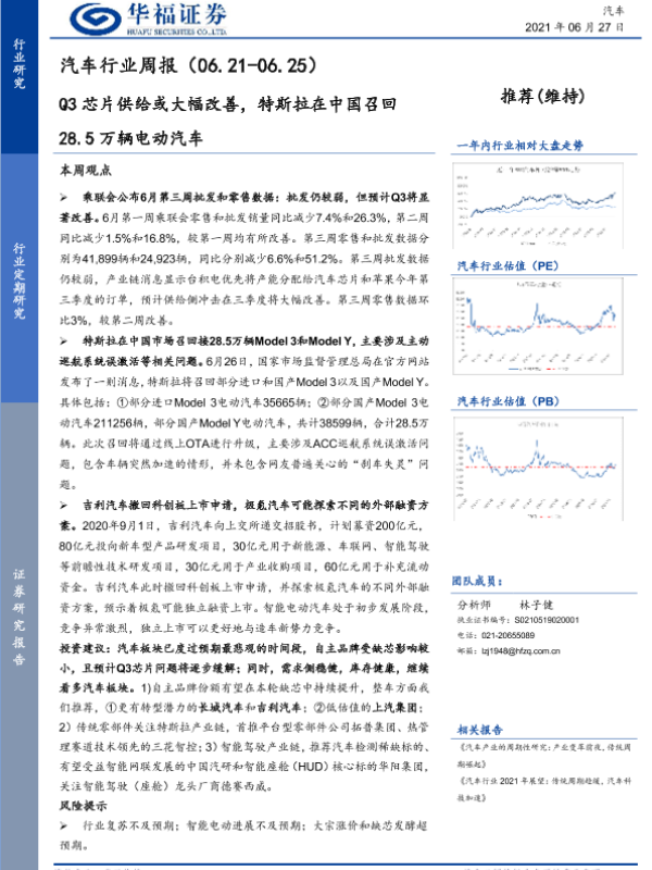 【华福证券】【20210627】汽车行业周报:Q3芯片供给或大幅改善,特斯拉在中国召回28.5万辆电动汽车-7页