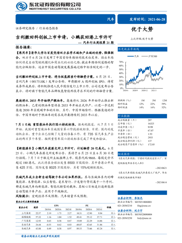 【东北证券】【20210628】20210628-东北证券-汽车行业周报第21期:吉利撤回科创板上市申请,小鹏获回港上市许可-14页