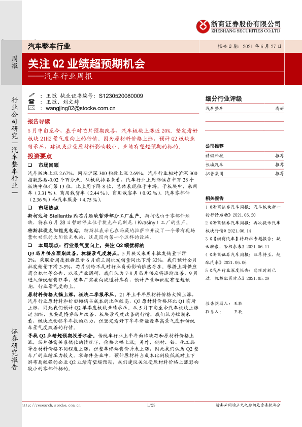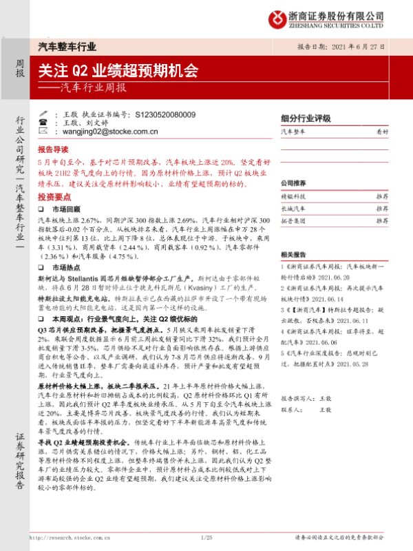 【浙商证券】【20210627】20210627-浙商证券-汽车行业周报:关注Q2业绩超预期机会-25页