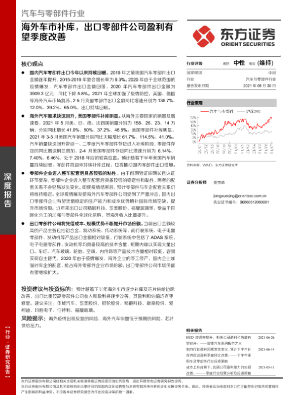 【东方证券】【20210630】汽车与零部件行业:海外车市补库,出口零部件公司盈利有望季度改善-21页