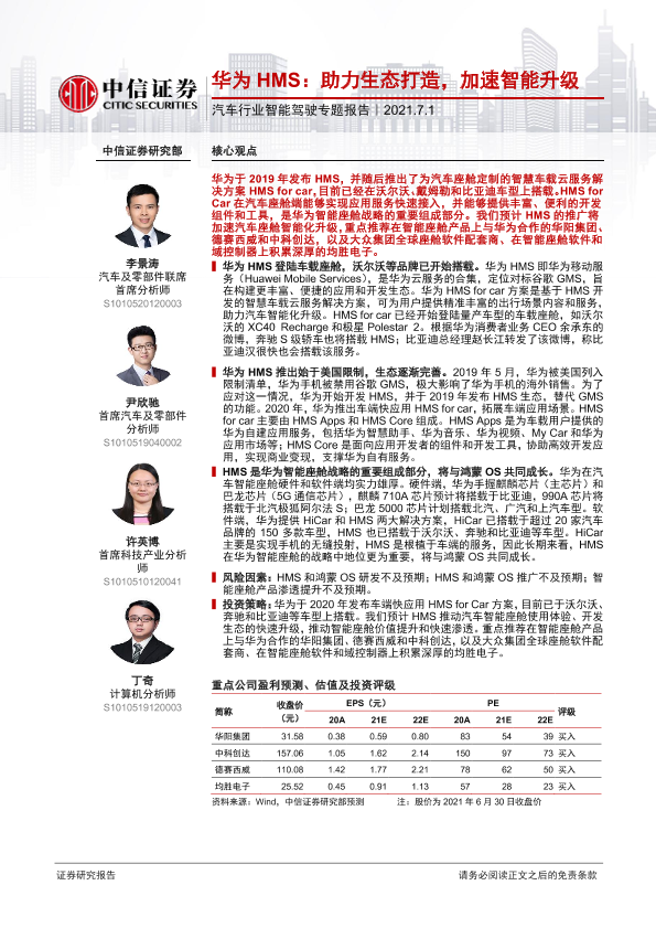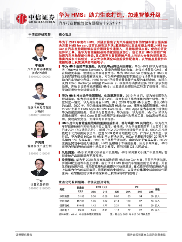 【中信证券】【20210701】20210701-中信证券-汽车行业智能驾驶专题报告:华为HMS:助力生态打造,加速智能升级-12页