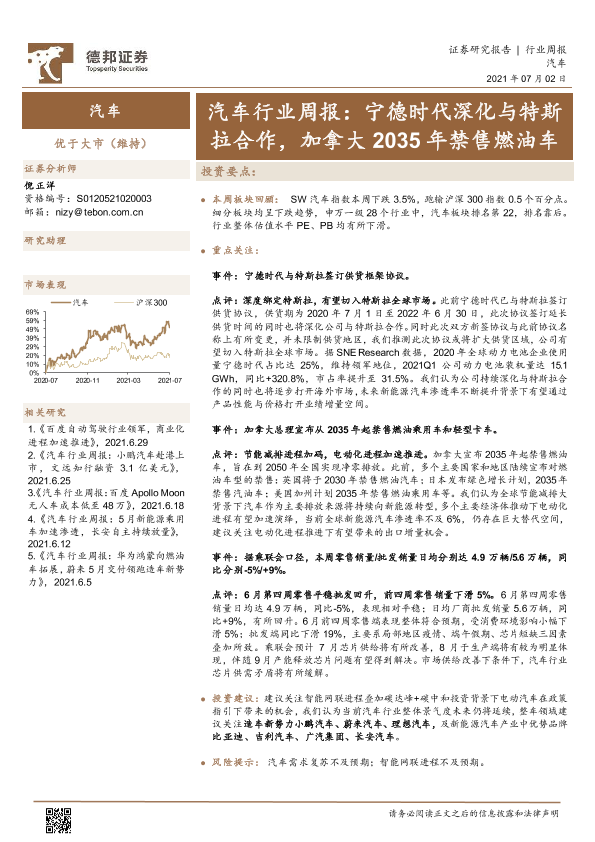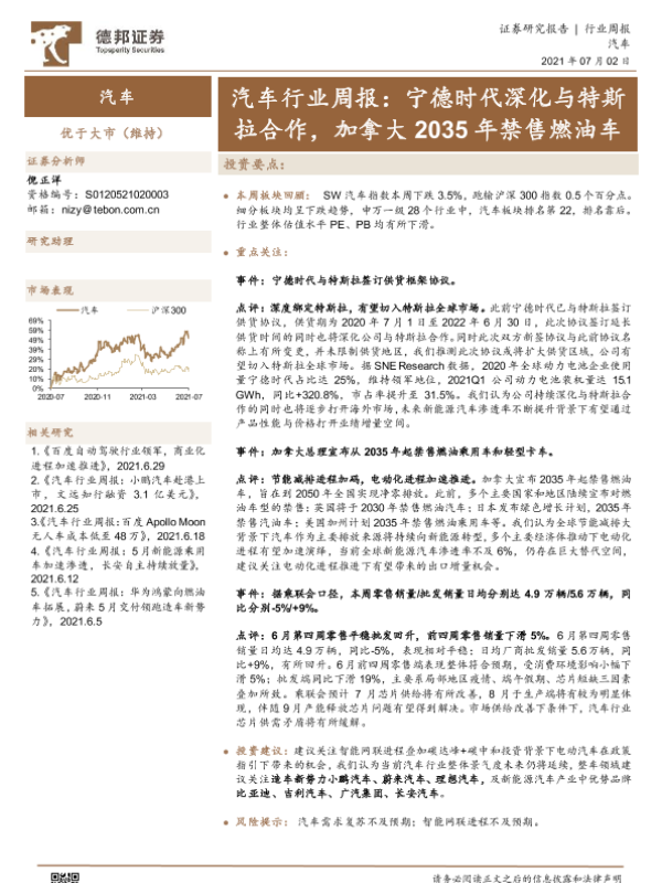 【德邦证券】【20210702】汽车行业周报:宁德时代深化与特斯拉合作,加拿大2035年禁售燃油车-14页