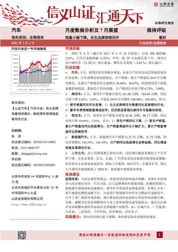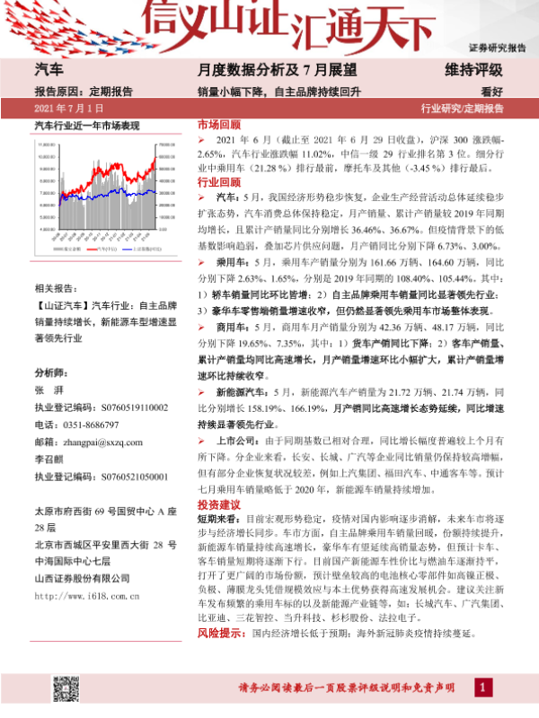【山西证券】【20210701】20210701-山西证券-汽车月度数据分析及7月展望:销量小幅下降,自主品牌持续回升-27页