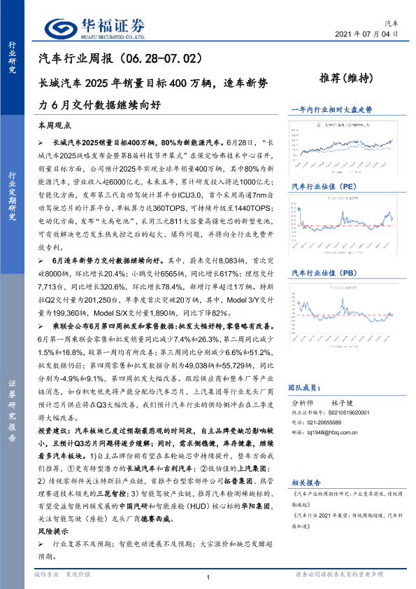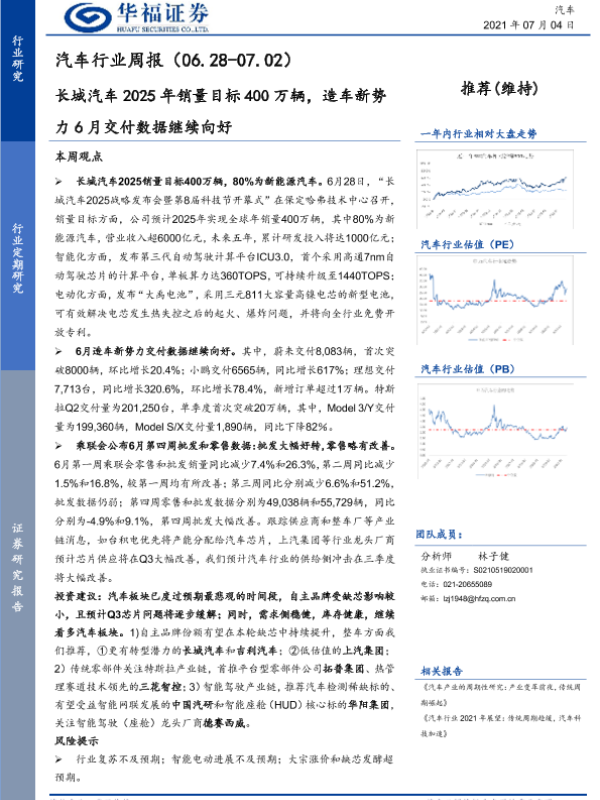【华福证券】【20210704】20210704-华福证券-汽车行业周报:长城汽车2025年销量目标400万辆,造车新势力6月交付数据继续向好-7页